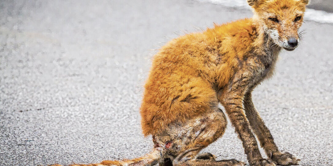 An Räude erkrankte Füchse zeigen Verhaltensstörungen und haben haarlose, entzündete und verkrustete Hautstellen. Zudem halten sie sich gerne in Siedlungsnähe auf.