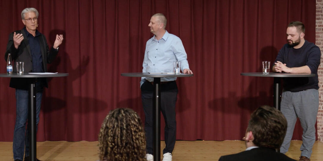 Karl Malin (VU), Marcel Kaufmann (FBP) und Samuel Schurte (Junge Liste, v. l.) stellten sich den Fragen von Valeska Blank («Vaterland») und Hannes Matt («Volksblatt»).