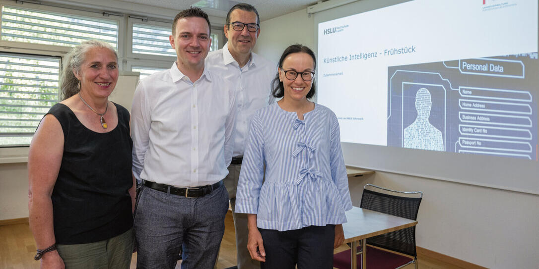 Ursula Uttinger (HSLU), Jakob Elmiger (Wirtschaftsinformatiker), Frank Heinzmann (HSLU) und Marie-Louise Gächter (Datenschutzstelle) luden zum KI-Frühstück ein (v. l.).