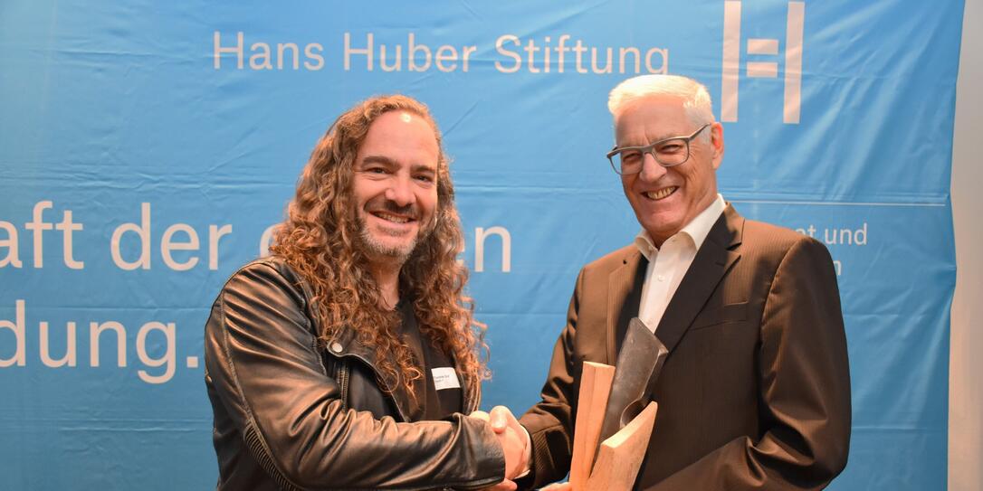 Thomas Graf (l.) nimmt den Anerkennungspreis der Hans Huber Stiftung von Stiftungspräsident Christian Fiechter entgegen.