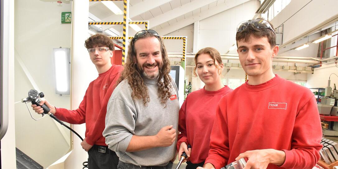 Thomas Graf mit dem lernenden Polymechaniker David Gerster (links), der lernenden Polymechanikerin Nina Häring und dem frisch diplomierten Polymechaniker Felix Sprenger.